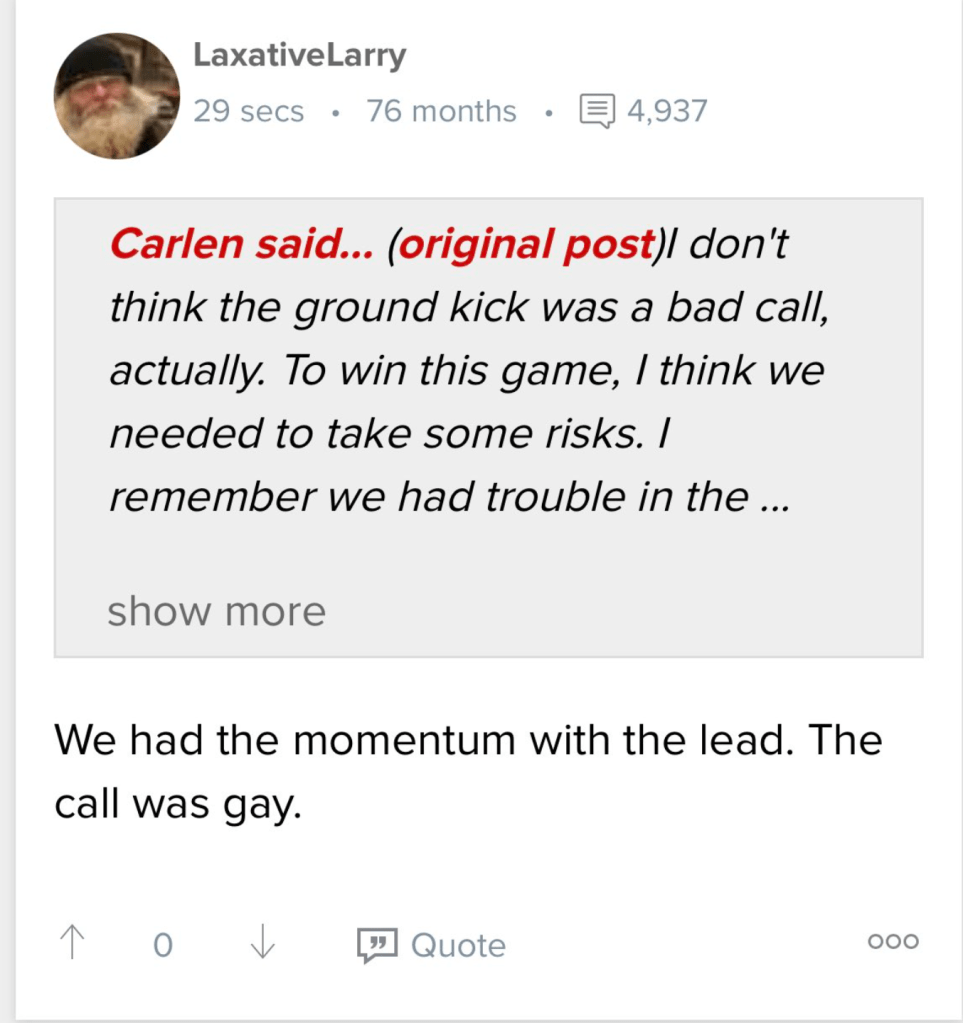 #40 – This post made the countdown primarily due to the poster’s board name “LaxativeLarry”.