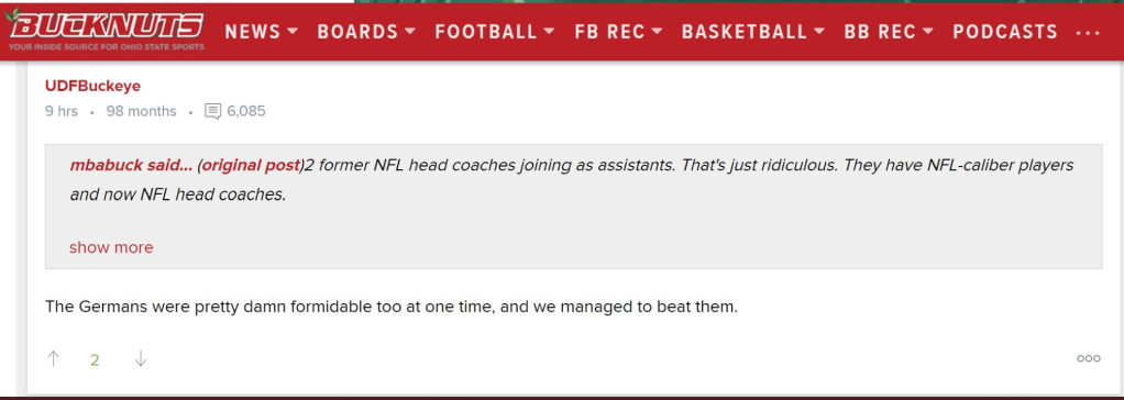Buckeye fans wondered how they could ever compete with Alabama, as the future looked grim, they found solace in the fact that the Nazis too were ultimately defeated: