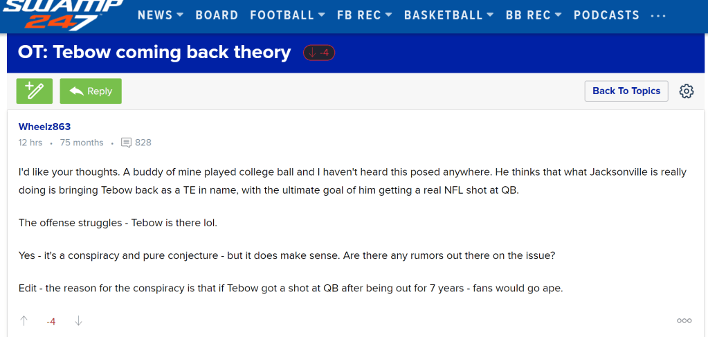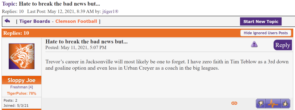 One Clemson fan didn’t like Lawrence’s chances of success while teaming up with Urban Creyer and Tim Teblow in Jacksonville however: