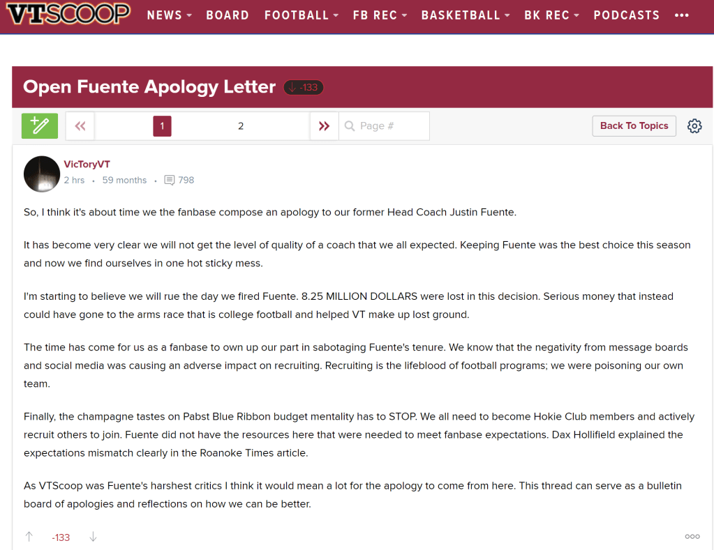 19. Virginia Tech fan tries to convince his fellow fans to compose an apology letter to Justin Fuente for sabotaging his career.