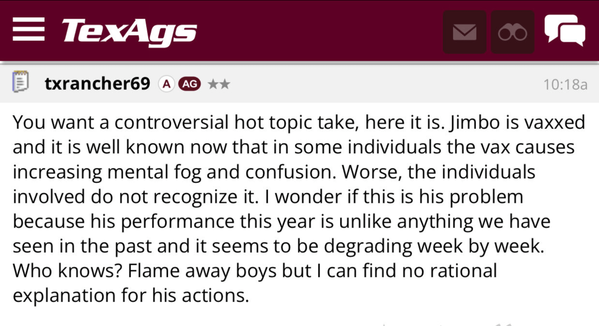 1. Jimbo Fisher got vaccinated and lost the mental capacity to coach.