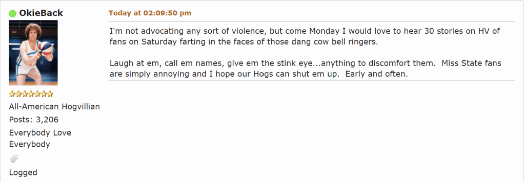 4. Arkansas fan summons his fellow Razorback fans to fart in the face of any and all visiting Mississippi State fans.