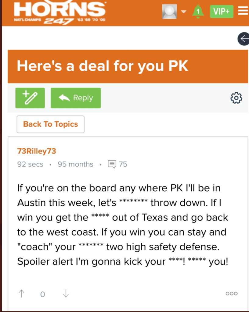2. Texas fan challenges Longhorns defensive coordinator Pete Kwiatkowski and his two high safety defense to a fight.