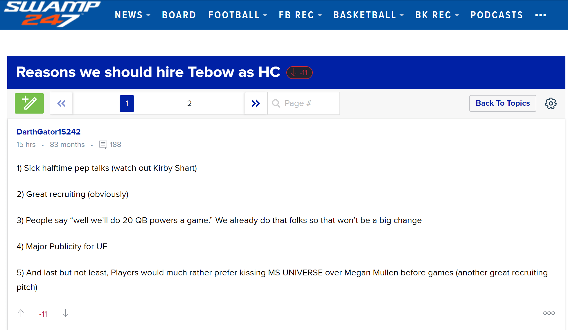 18. Florida fan composes five compelling reasons to hire Tim Tebow as head coach.