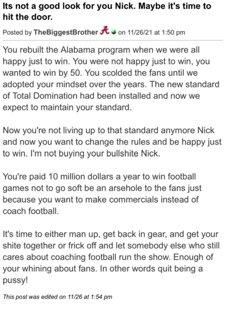 15. Alabama fan wants Nick Saban to either shape up or ship out.
