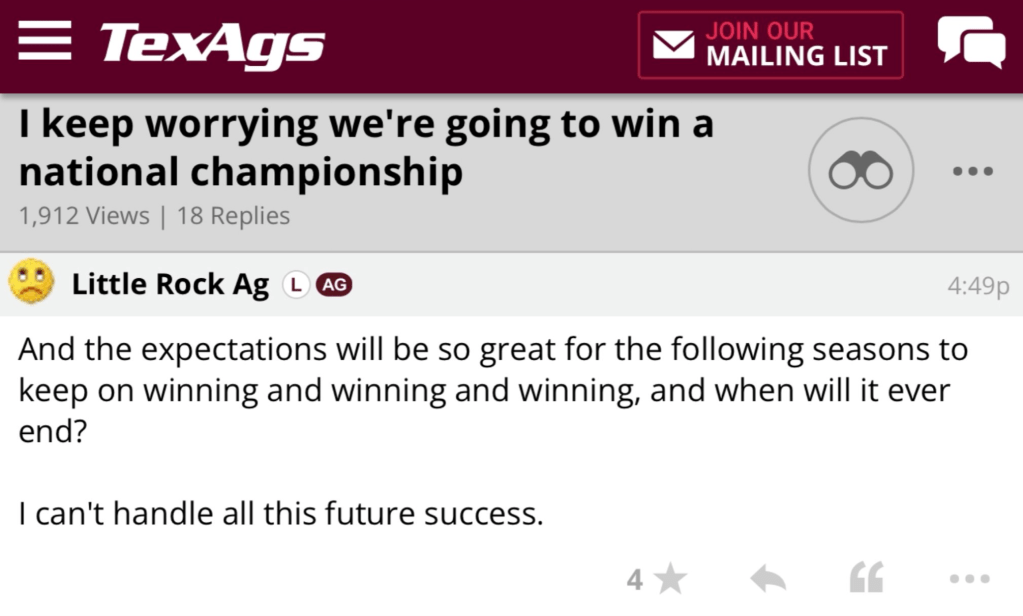 25. Texas A&M fan is worried about how to handle all of the future success they’re going to have.