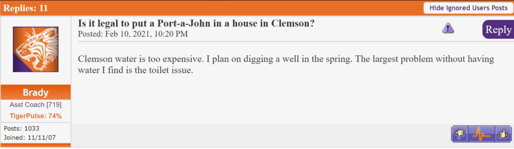 92. Clemson fan wanted to put a port-o-potty in his house.