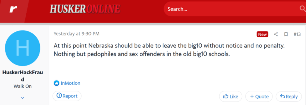 89. Nebraska shouldn’t be forced to stay in the B1G with a bunch of pedophiles and sex offenders.
