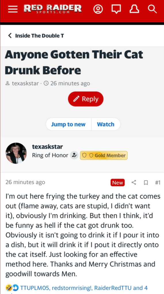 68. Texas Tech fan wanted to know the best way to get his cat drunk.