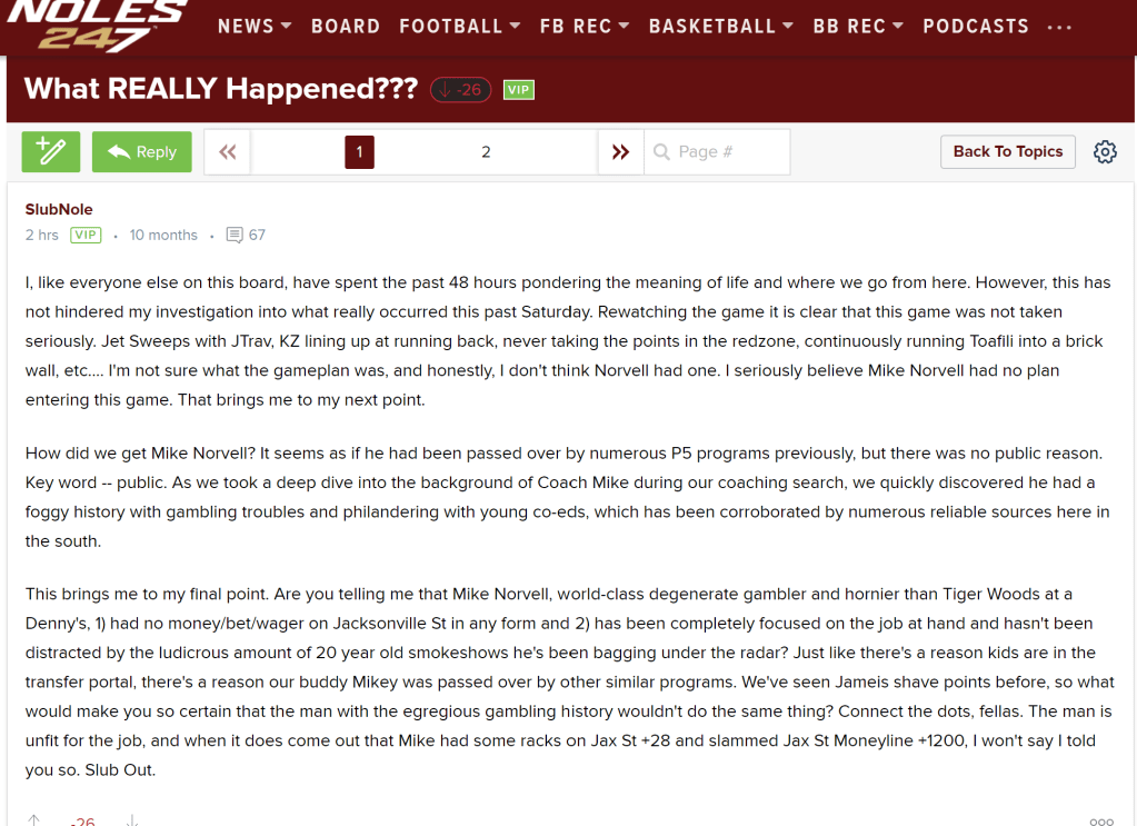 86. Mike Norvell is a degenerate gambler and may be fixing games.