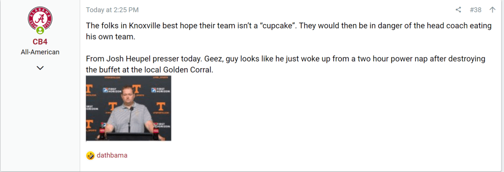 33. Josh Heupel looks like he just woke up from a nap after visiting a Golden Corral.
