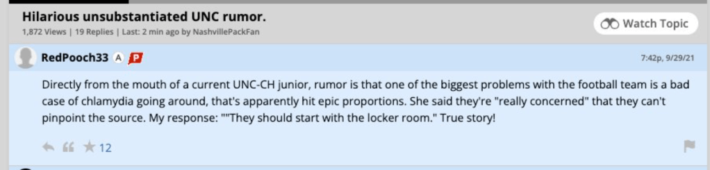 31. NC State fan says North Carolina’s team is infected with chlamydia.
