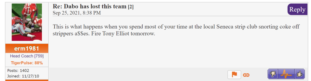 34. Clembarrassing! Clemson fan wanted Dabo and Tony Elliot fired.