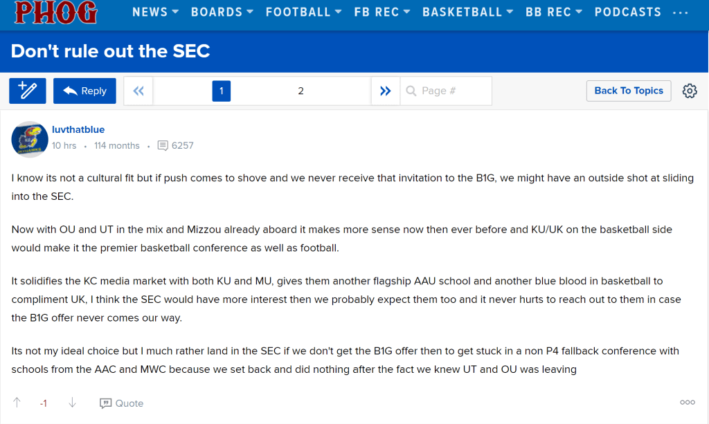 42. Kansas’ back up choice in conference expansion is the SEC.