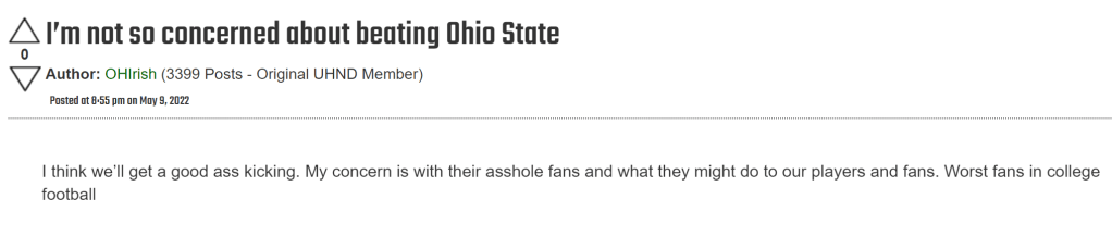 22. Notre Dame is going to get beat by Ohio State, this Notre Dame fan is just worried about their players and fans getting hurt.