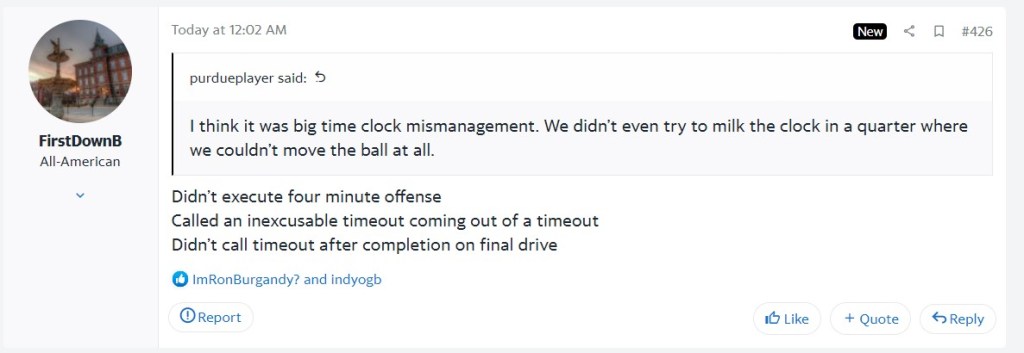 In a fairly impressive two minute drill, Sean Clifford and company moved the ball down field and scored the go-ahead touchdown with just under a minute left. With any semblance of a run game, Purdue drains the clock and Clifford doesn’t get this opportunity. Unfortunately for the trains of West Lafayette, Jeff left his watch at home today and decided to stay the course.
