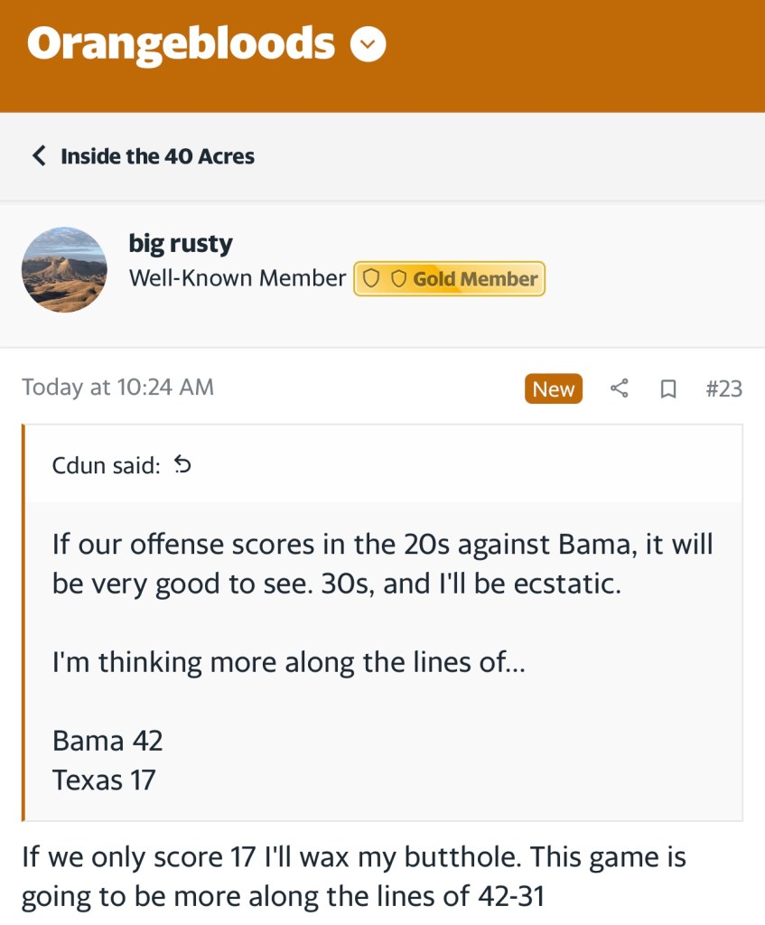 I know it’s hard to expect much when you’re a 20-point dog at home against the top-ranked team in the nation but some feel pretty confident. This is a measuring stick game for Texas. A loss won’t bring doom but if the team doesn’t show up, Horns fans will lose it.