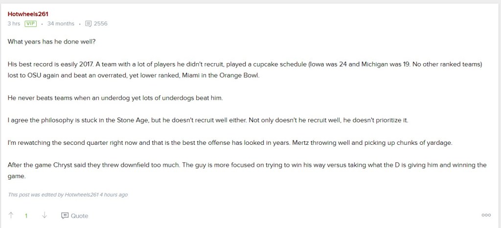 The B1G West is gonna B1G West I guess. Spreading your opponent out (which actually worked in Madison) is the mistake that the coach identified yesterday. The fans don’t seem to like that. Trust me Badger fans, it can get a lot worse.
