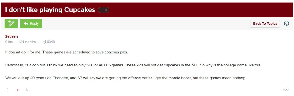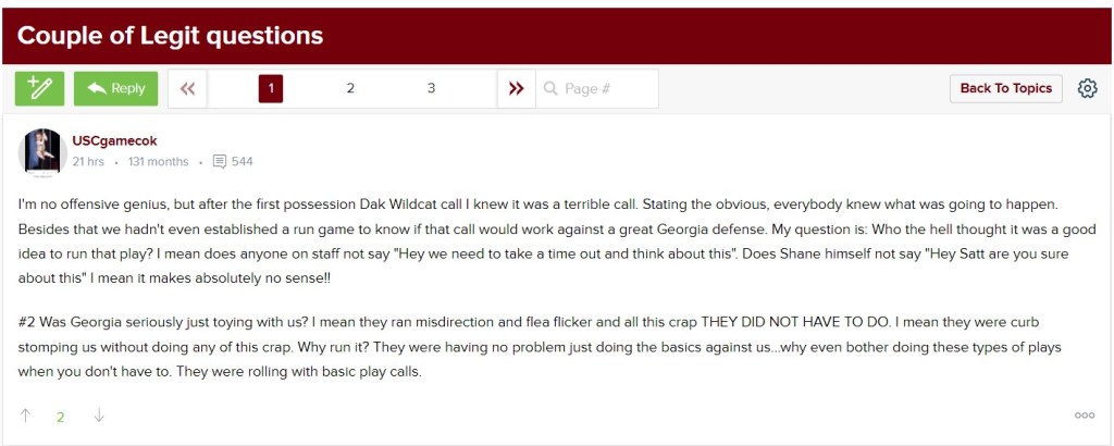 Many folks, even outside of the *Game Wiener fanbase, believed that South Carolina was on their way towards being the premier program in the state. We are clearly not there yet. Yes, Georgia is going to blast virtually everyone this year, but to do so on your home field while your out of conference rivals kept it to a one score game during their down year? Not good.