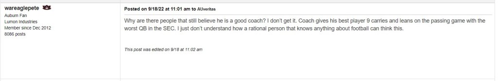Here’s the thing: every conference has bad teams, but Auburn has enough talent to not be in that category. As this fine gentleman says, perhaps next week they’ll give their best player a few more carries.