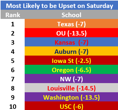 Below are the the 10 most likely teams to be upset today, including Northwestern being the annual B1G team to lose to a MAC team, a tradition since 2005.