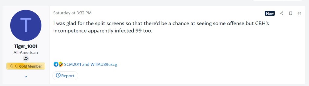 I appreciate Auburn fans trying to take solace in their pedestrian offense. As an Iowa fan, I’m an expert on this topic. But if fans wanted to watch Aaron Judge hit a homerun that isn’t the actual record, wouldn’t they just, you know, turn the channel to the baseball game? Thank you, ESPN, for continuing to polarize your broadcasts.