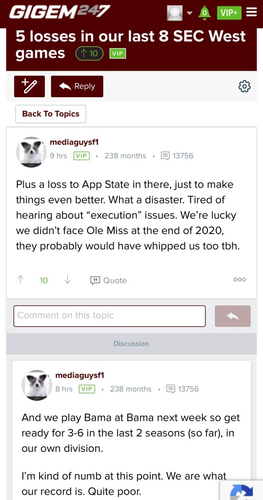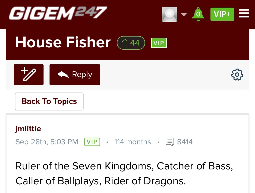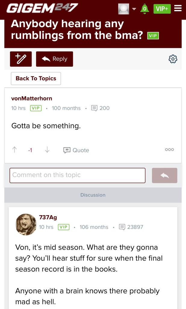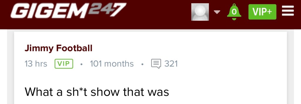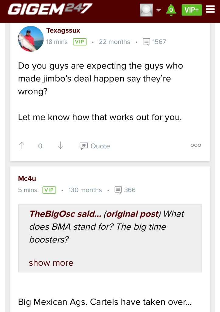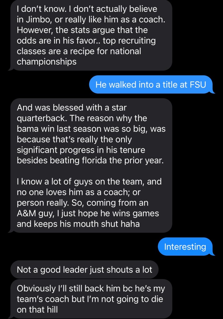 Before we get into the Aggies fans’ posts, I’m taking the liberty of posting what my cousin, a recent Texas A&M graduate and former Aggie athlete, had to say about Jimbo prior to the Arkansas game.