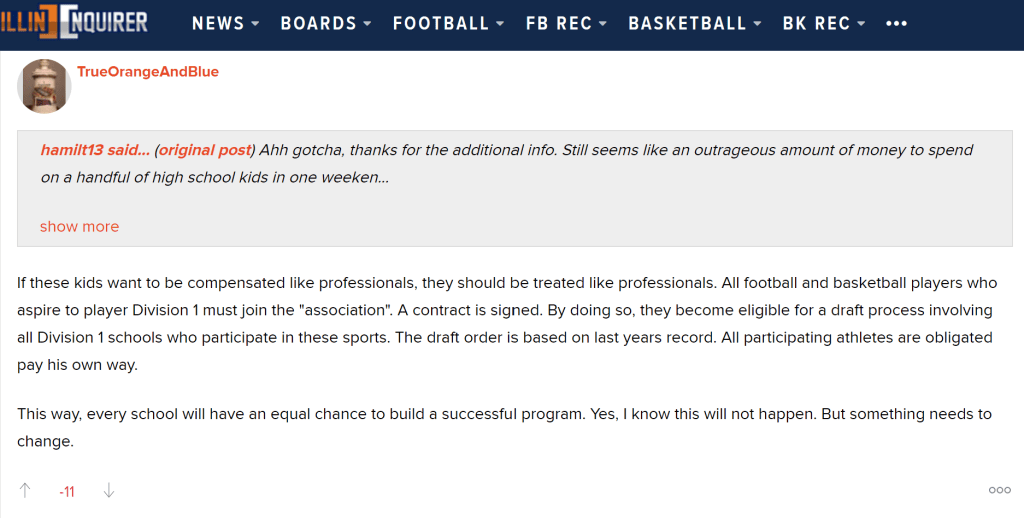 16. Illinois fan wants a CFB draft and also wants players to pay their own way.