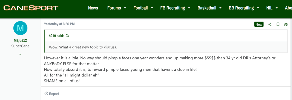 23. This Miami fan don’t want no pimple face kids making more than him.