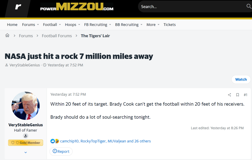 20. If NASA can hit a meteor from 7 million miles away, Brady Cook should be able to complete some passes.