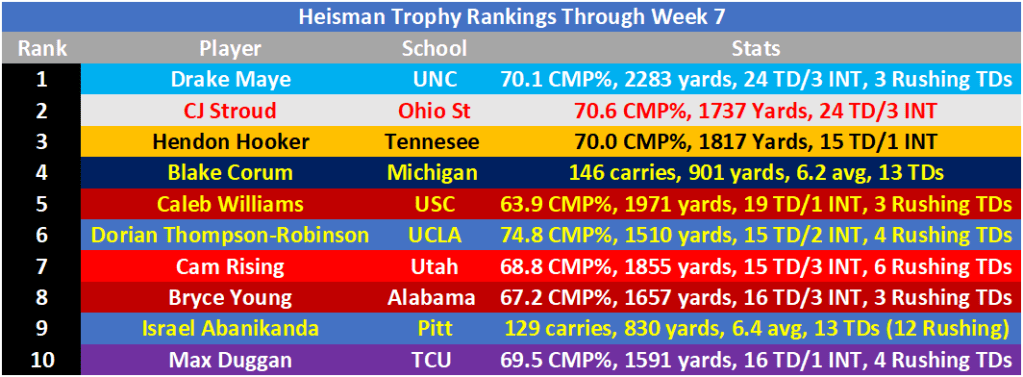 Number one may come as a suprise to most but if we’re awarding the top player in college football, which is what each voting member is instructed to do, the stats speak for itself. Drake Maye is playing out of his mind and should be considered the front runner at this point.