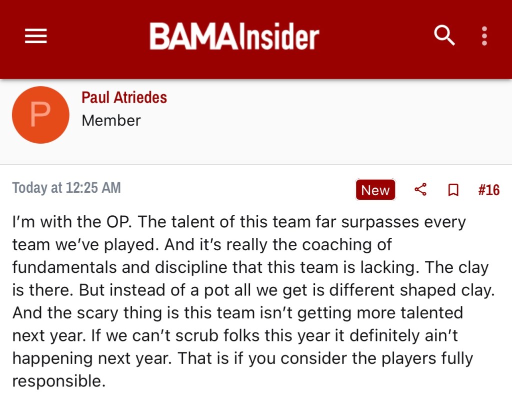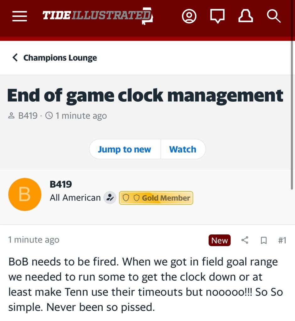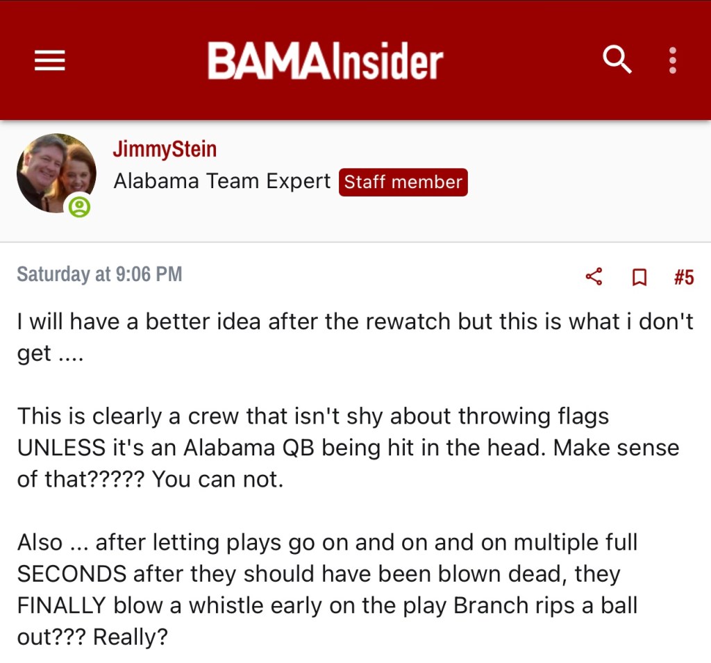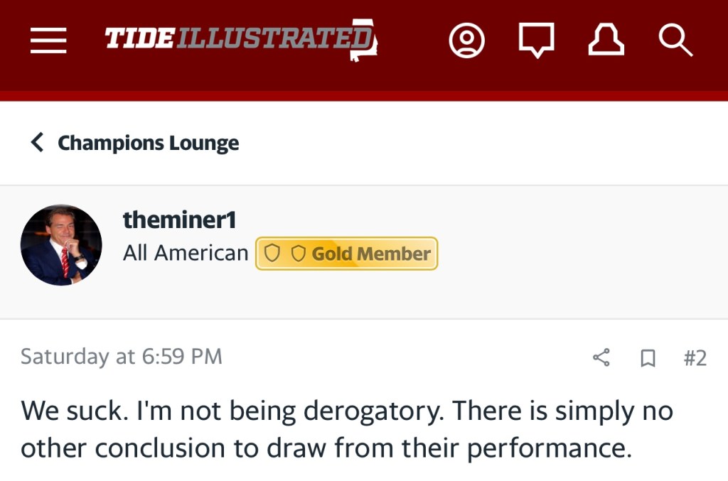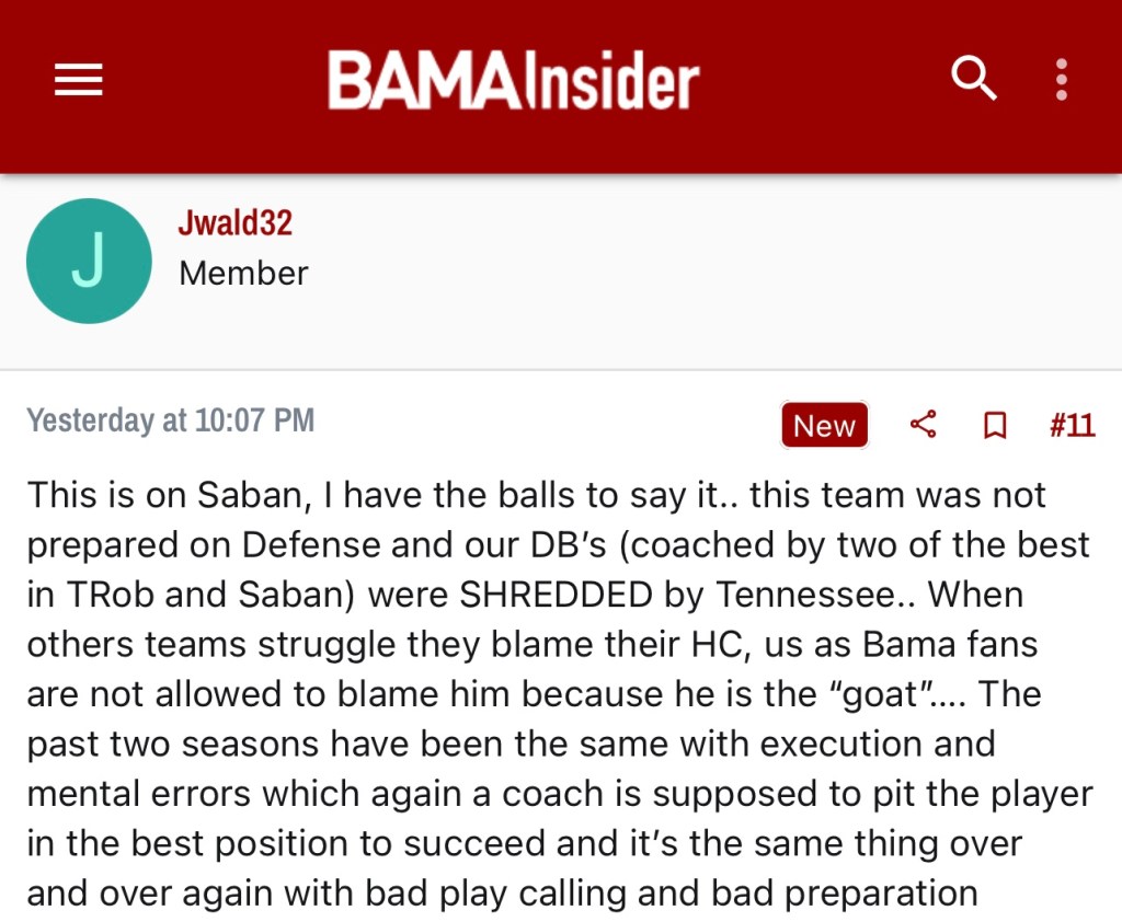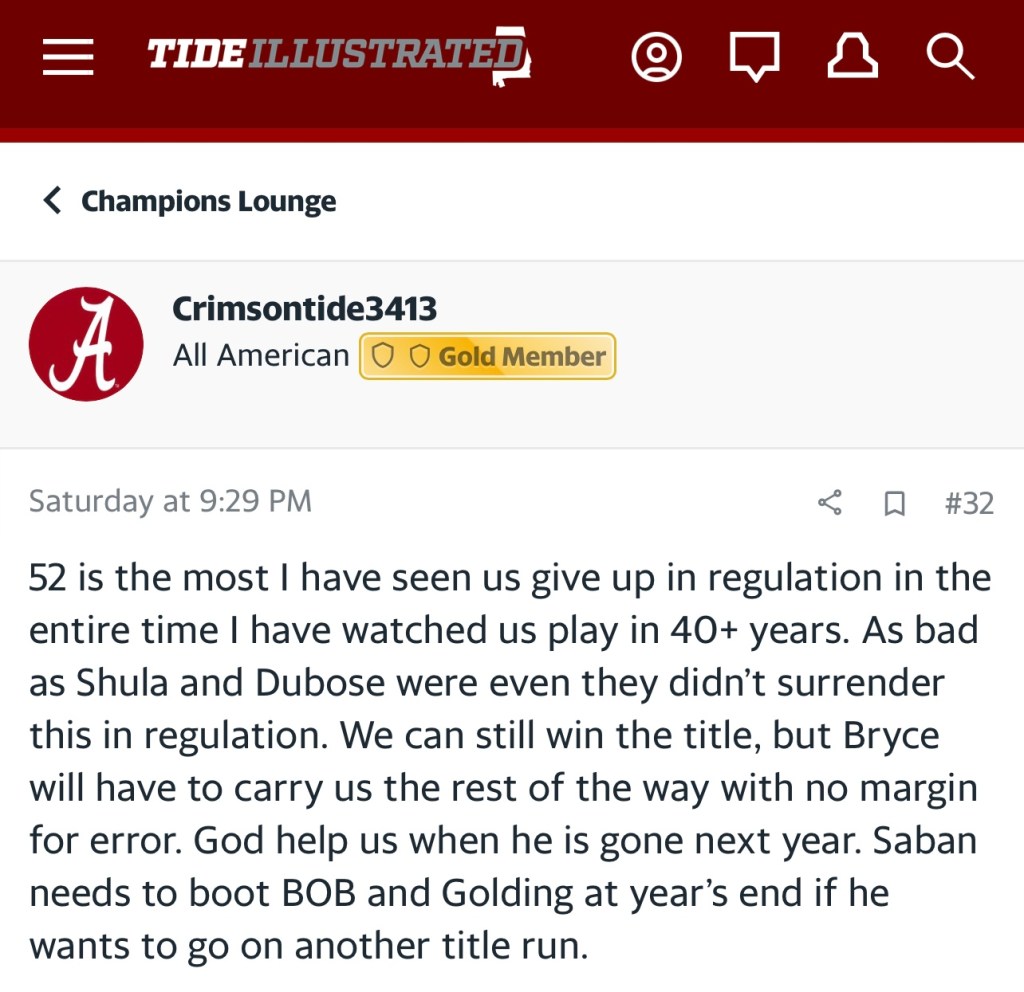 In Saban’s previous 15 seasons at Alabama, the Crimson Tide has only gone undefeated twice. So hiccups aren’t foreign but it’s wild to me that so many are questioning every method after something relatively normal happens. By the amount of blaming happening in the boards, it may help Bama fans to know they aren’t the only big losers from Saturday.