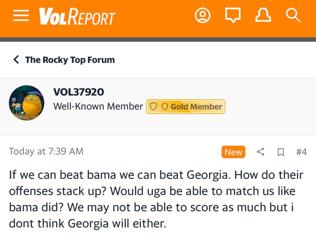 Vols fans, y’all better act like an 18-wheeler heading downhill and pump those brakes. First, you can’t compare offenses that run different schemes. That’s downright silly. UGA TE Brock Bowers can take over a game unlike Alabama’s Cameron Latu and WR Ladd McConkey can seemingly do it all. Secondly, playing Alabama at home is different than playing top-ranked Georgia in Athens. Throw in the additional motivation Tennessee had going into the Third Saturday in October and it was a perfect environment for a massive win. I will say that the Alabama win gives Tennessee a massive boost in confidence so they certainly have a chance at beating Georgia but let’s be realistic about the situation. A tougher task lies ahead, Vols fans. As we millennials are fond of saying, you better check yourself before you wreck yourself.