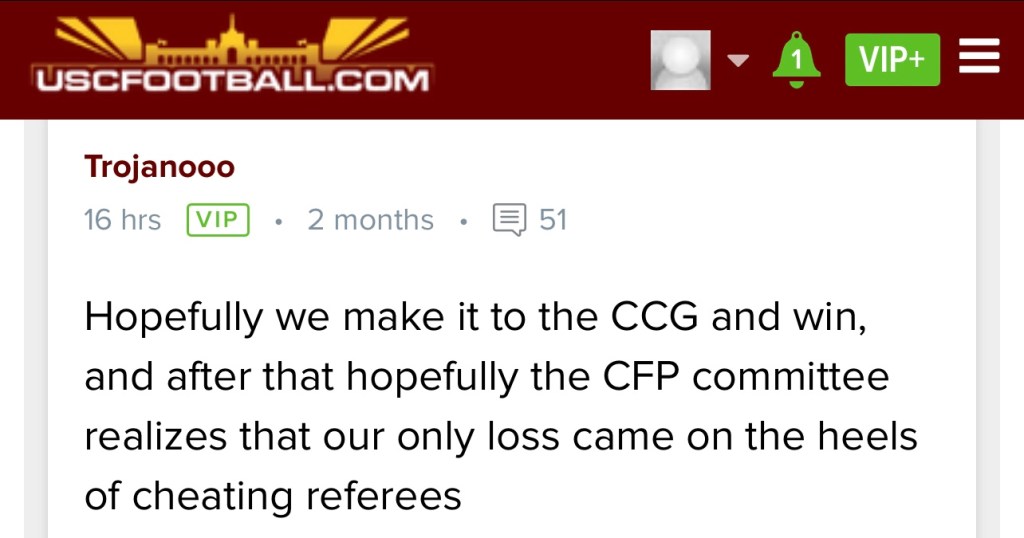 The only thing I disagree with here is the cheating refs part. I’m sure some do cheat but I think it’s just them being dumb while also having to watch 22 dudes wail on each other all at once. It’s mostly the instant chaos but after watching the refs struggle in Alabama-Tennessee you can’t rule out dumb. As for the other parts, I’m pretty sure the conference title appearance will happen but a playoff appearance is dicey at best. The Utah game was one of just two against ranked opponents the Trojans have this year. Even if it’d won and ended the season undefeated, USC would likely still need some dominos to fall in order to make the playoffs because of the PAC-12’s place on the conference totem pole. Outside of UCLA, the Trojans’ remaining games are against Arizona, Cal, Colorado and Notre Dame, who currently have a combined record of 10-15. Wins over these teams won’t move the needle much. It’ll take a convincing win over UCLA and multiple losses to jump some of the teams at the top. You can hope, but keep some perspective; the Trojans aren’t even through Year 1 of Lincoln Riley and there’s talk about them competing for nattys. Don’t fret if things don’t work right now, they will eventually.