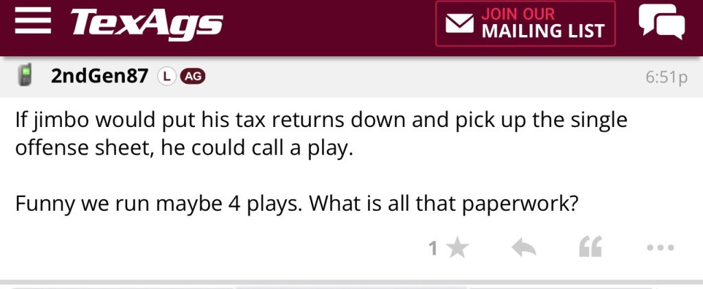 Speaking of Jimbo FIsher, we can’t believe he’s doing his tax returns on the sidelines. Definitely not offensive play sheets. If only he would focus on the X’s & O’s and not his 1099, Texas A&M would be undefeated by now, right?