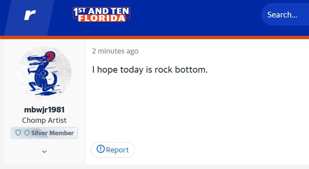 This is a weekly tweet by Florida fans. Sadly, it happened twice this week with the loss of Cormani McClain to Miami and then getting run out of the stadium against one of their biggest rivals in Georgia. Will this be rock bottom for Florida? They do get the opportunity to play known-tax accountant Jimbo Fisher next week.
