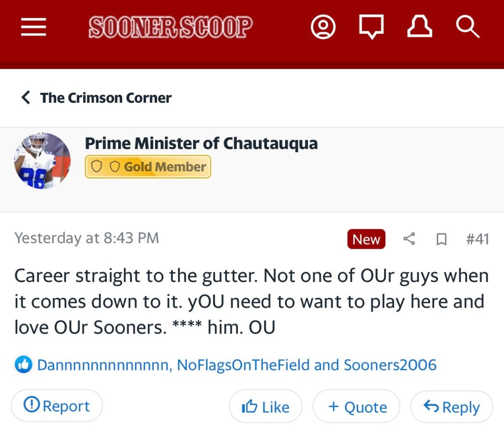 Oklahoma fans are quick to call Texas A&M a cult while capitalizing OU in every word that contains the words consecutively. But seriously, the most embarrassing thing you can do as a grown human is trash talking a 17-year old kid about his college decision. But what would we expect from a fan base that is definitely not still mad Lincoln Riley left.