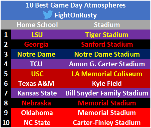 Below are the top 10 best game day atmospheres for the week. Happy game day everyone!
