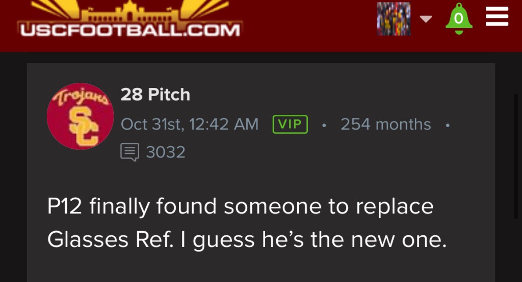USC fans, still primed from the refs calling two extremely questionable roughing the passer calls prior to their bye week, were haunted again last week vs Arizona. While USC ran their 2-minute drill, the refs misspotted the ball twice and allowed crucial seconds to wind off the clock before the ball was spotted and led to the Trojans not scoring before halftime. A toddler with a whistle could have done a better job.