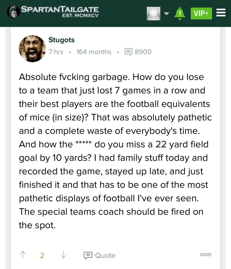 I feel for this man. Not only did family stuff get in the way of him watching his beloved Spartans lose to an Indiana team that lost 7 straight, he had to stay up late in order to do it. Lest we forget this man’s team lost to mice-sized football players. Pathetic showing by the Spartans.