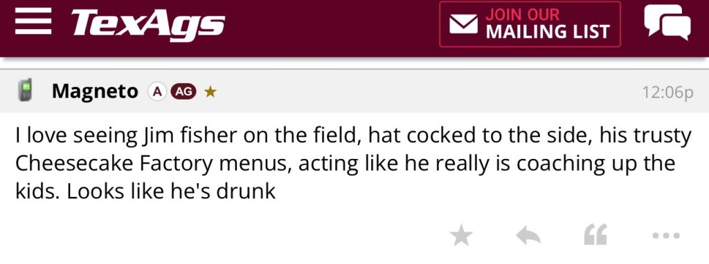 I take offense to this as a Cheesecake Factory fan boy. If Jimbo was really holding a Cheesecake Factory menu, there would be fantastic options for days. Instead he’s calling the same awful plays he’s called all year long. At Cheesecake Factory I know that I can get a mix of food that is so confusing it makes all the sense in the world. At Texas A&M I get wasted talent.