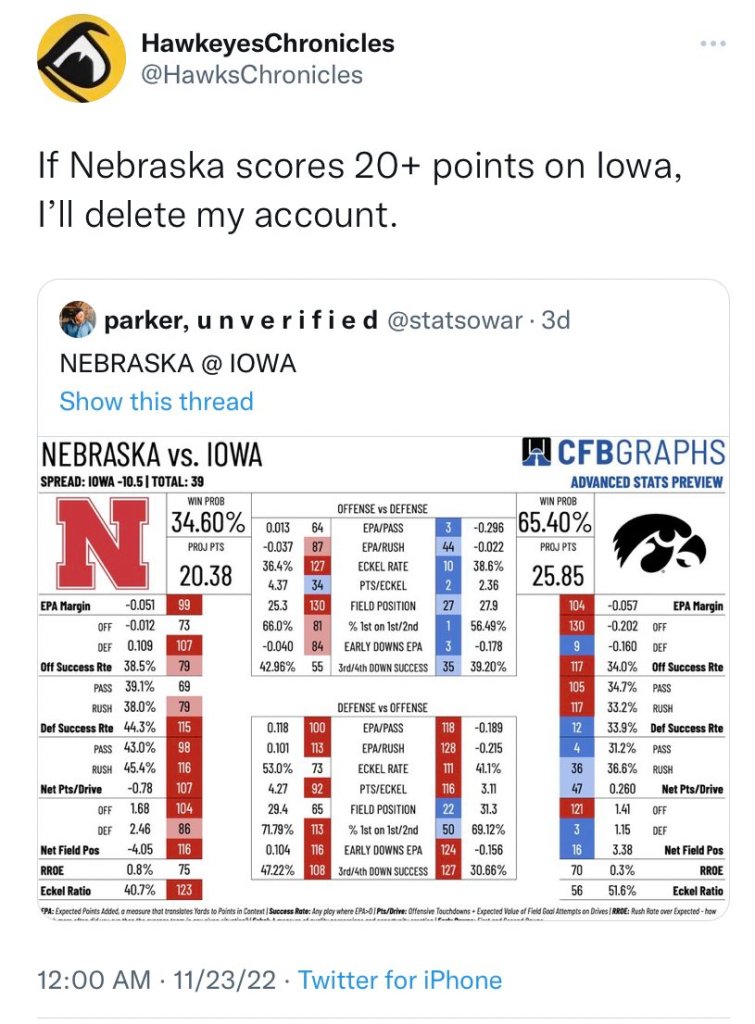 As of this writing, Hawkeyes Chronicles account is still active after Nebraska put up 24 points against Iowa on Friday night. In fact, rumor has it if you tweet this at them they’ll even block you. Why make a Rhule you can’t follow?