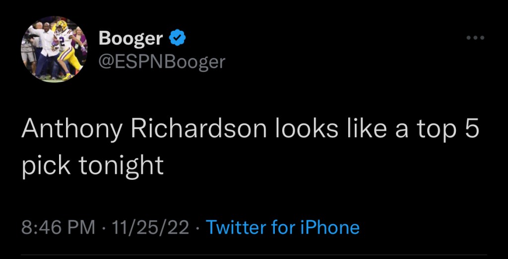 Anthony Richardson had a 33% completion percentage and somehow Booger, who has been relegated from Monday Night Football commentator to midweek college football analyst, thinks that’s worthy of him being a top 5 quarterback. What’s scary about the NFL is this may actually turn out to be true, but it won’t be based off what we all watched him do vs Florida State.