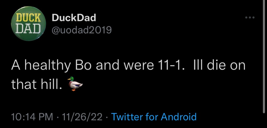 It’s nice of you to die on that hill but you didn’t make it to the top because you’re being trampled by others telling you how bad of a take this is. A healthy Bo Nix could have helped, but the reason Oregon failed so miserably is because their defense is so historically bad despite playmakers at multiple positions and a defensive-minded head coach. That defense gave up 21 straight points in 13 minutes to an Oregon State offense that is one dimensional.