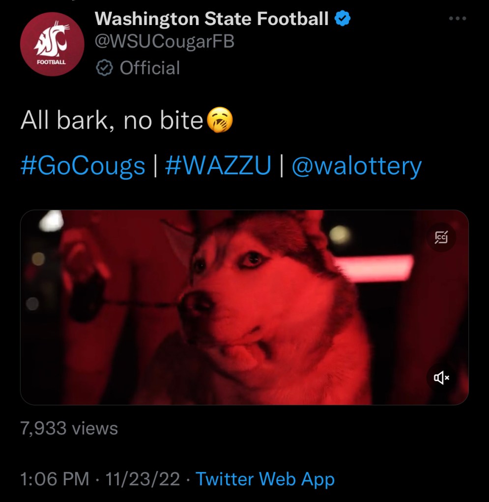 Usually I think rivalry hype videos are awesome, but this is a blatant exploitation of this good boy. Fortunately his Huskies won 51-33 and provided tons of bark and bite.