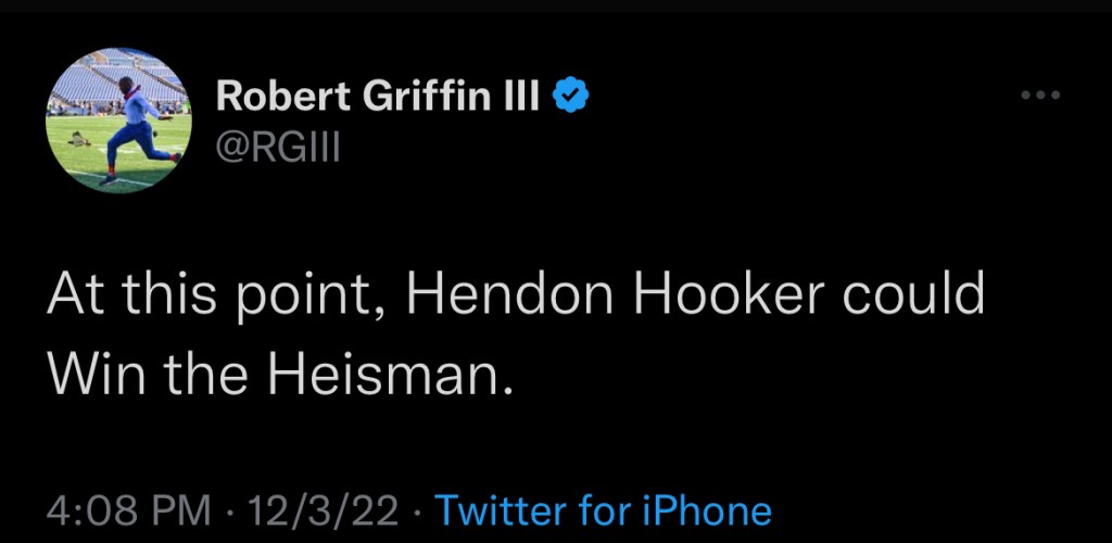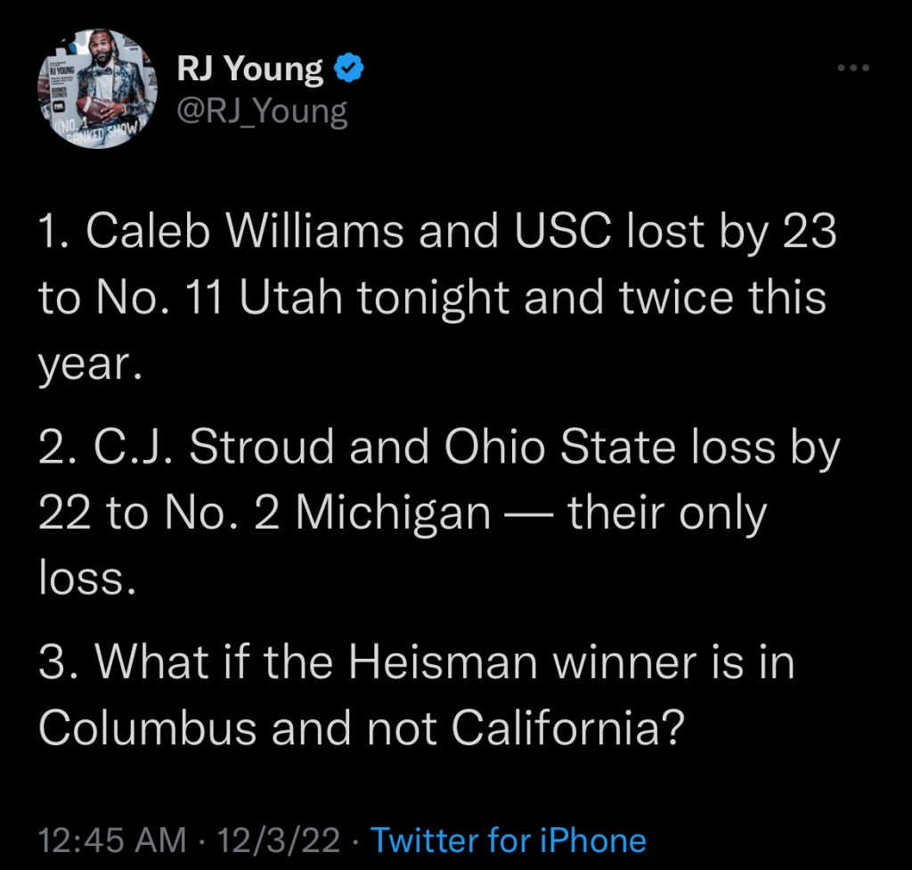 I have faith that most Heisman Trophy voters aren’t looking at a single game to make their decisions but realize there are emotional people like RJ Young out there. The best player in college football deserves the award. Yes, he’s fair to question where the Heisman winner is it but to do it by suggesting a single game, where both QBs played their brains out, is the reason why they win or lose isn’t it.