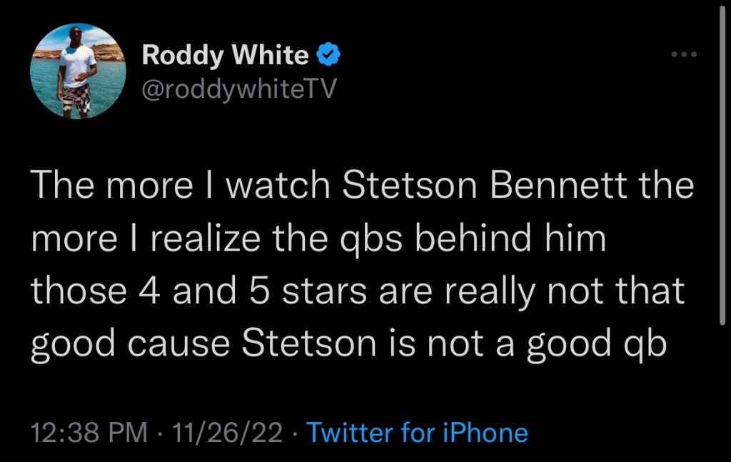 This tweet was going so well until the end. Stetson Bennett finished the year 5th in QBR and 1st amongst all QBs in EPA/game. Maybe those 4 and 5 star QBs behind him aren’t good, maybe they are, but Stetson Bennett has proved through his play that he belongs.