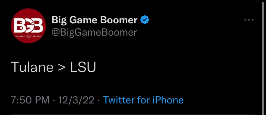 I have the upmost respect for what Willie Fritz has done at Tulane, and I’ve been hypercritical of LSU all season, but this is just flat out wrong. Tulane lost to Southern Miss, the same Southern Miss that had the doors blown off of them by Miami. If greater you mean they have more letters in their name or better uniforms (those light blue ones are fire), then sure. As a college football team in 2022? No