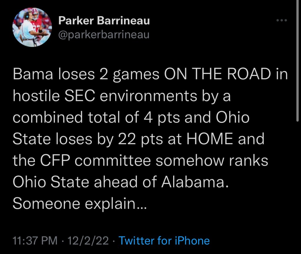 Allow me to explain: Alabama lost two games on the road to teams that ended up losing to teams ranked lower than them, making Alabama’s two losses look even worse. If Alabama wanted in so bad maybe they shouldn’t have lost to LSU and Tennessee.