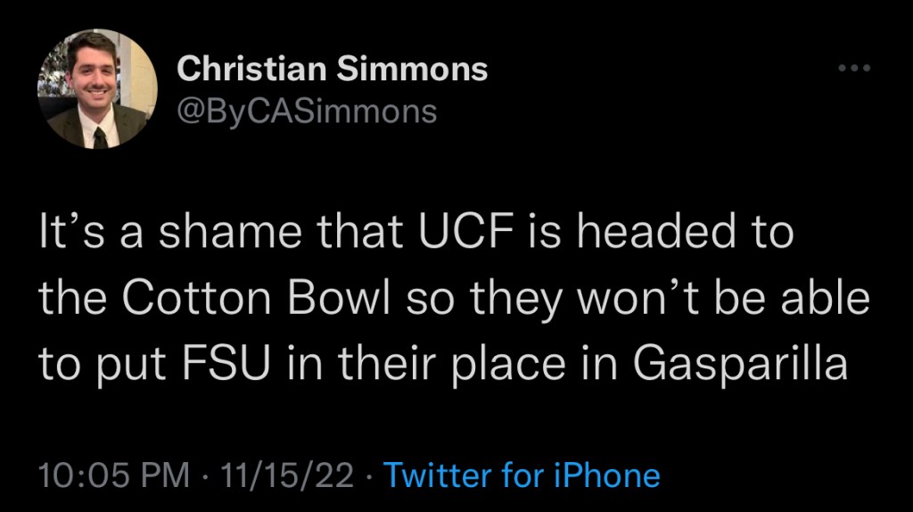 It’s a shame that UCF lost the game to go to the Cotton Bowl otherwise this tweet wouldn’t be here. Whatever bowl UCF lands it won’t be the one that Christian wants to be at.